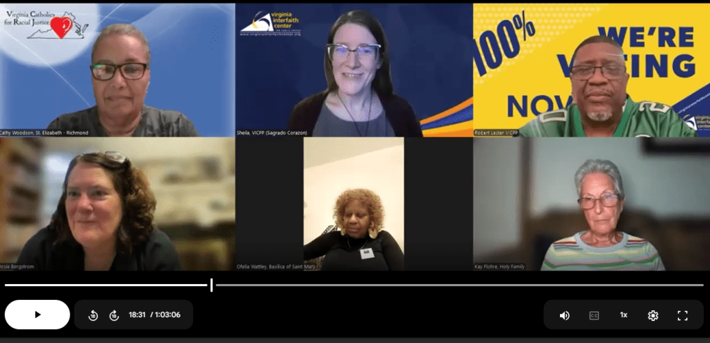 Guided by the VCRJ mission and the Catholic commitment to Faithful Citizenship, our October Monthly Gathering focused on linking state and local elections to the topic of racial justice. Guest speakers (below top then bottom, left to right)— Cathy Woodson, co-chair, VCRJ and moderator; Sheila Herlihy Hennessee and Robert Lester from the Virginia Interfaith Center for Public Policy, Josey Bergstrom and Ofelia Wattley from the Women’s League of Voters, and Kay Flore from the Hampton Roads Legislative Collaborative Table—shared their perspectives and experiences regarding elections and key issues at the state and local level that relate to racial justice.