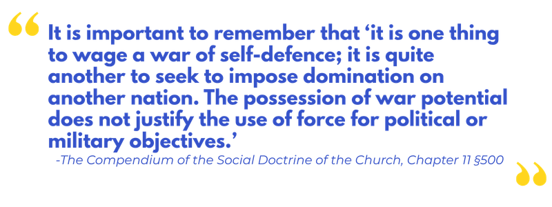 Pope Leo has dedicated his life as a servant leader of the Catholic Church and has been prepared for such a time as this. As the successor of Saint Peter, Bishop of Rome, and Vicar of Christ, Pope Leo speaks as the moral authority of the Catholic Church, interpreting and teaching Sacred Scripture and Sacred Tradition. In Tradition, we find the just war criteria, which this war does not meet. The initial framework for the Just War Theory dates back to Saint Augustine of Hippo in the early Church; in the 13th century Saint Thomas Aquinas formalized it. Just war criteria can be found in the Cathechism of the Catholic Church (Part III §§2307-2309 Avoiding War), the Compendium of the Social Doctrine of the Church (Chapter 11, §2, ¶¶ 500-501 Legitimate Defense), and the Pastoral Constitution on the Church in the Modern World, Gaudium et spes (Chapter 5, §1, ¶¶79-81 The Avoidance of War). These contain not only the just war criteria but the tenets of our faith in Catholic Social Teaching that compel us to work towards the common good.