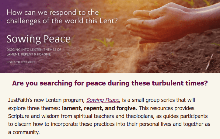 If you would like to participate in a Sowing Peace virtual group this Lent, please complete the form below. There is no cost to participate in a group. We will begin Monday, March 10, 2025, and journey together throughout the 6 weeks of Lent.